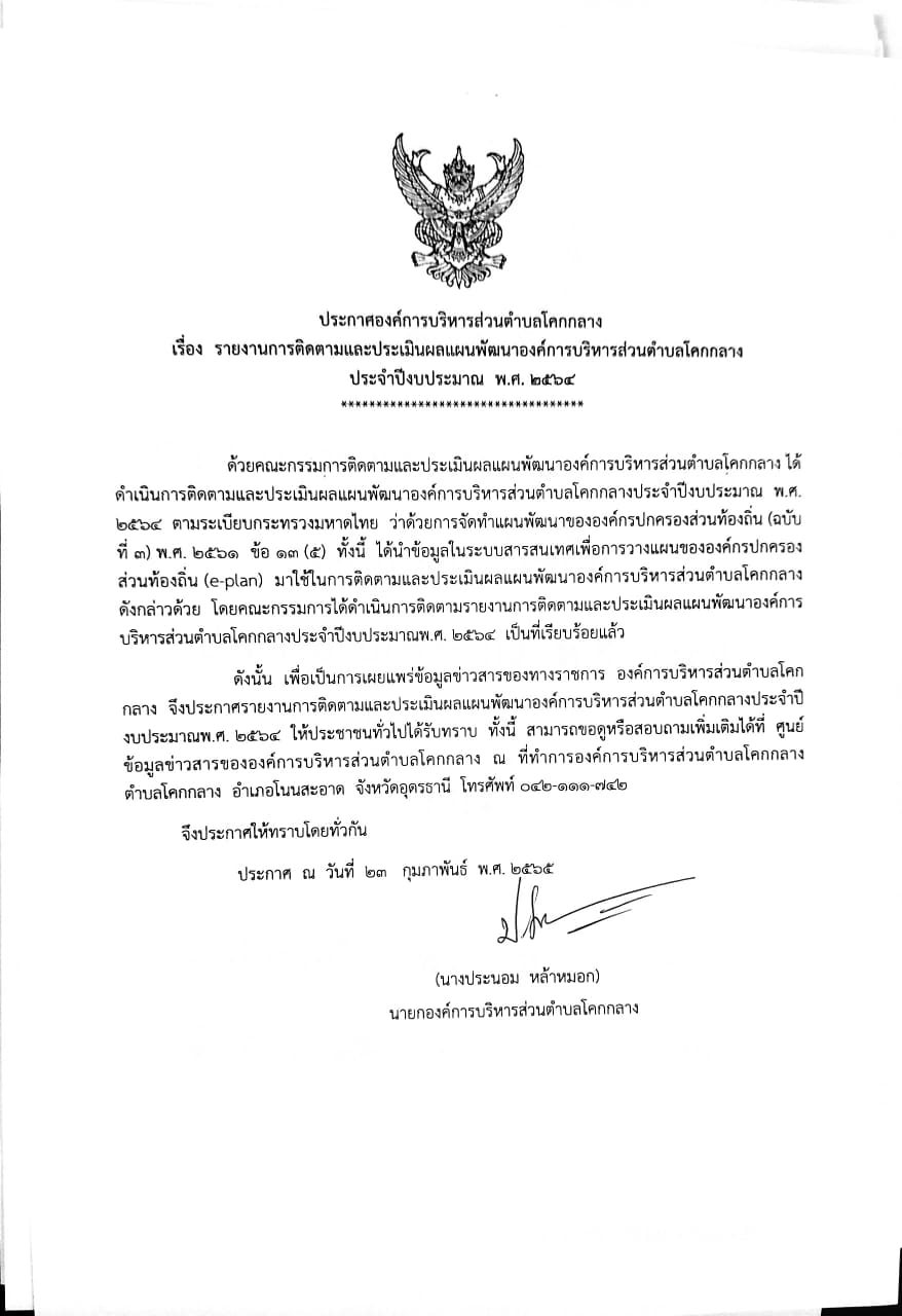 ประกาศรายงานการติดตามและประเมินผลแผนพัฒนา ประจำปี 2564