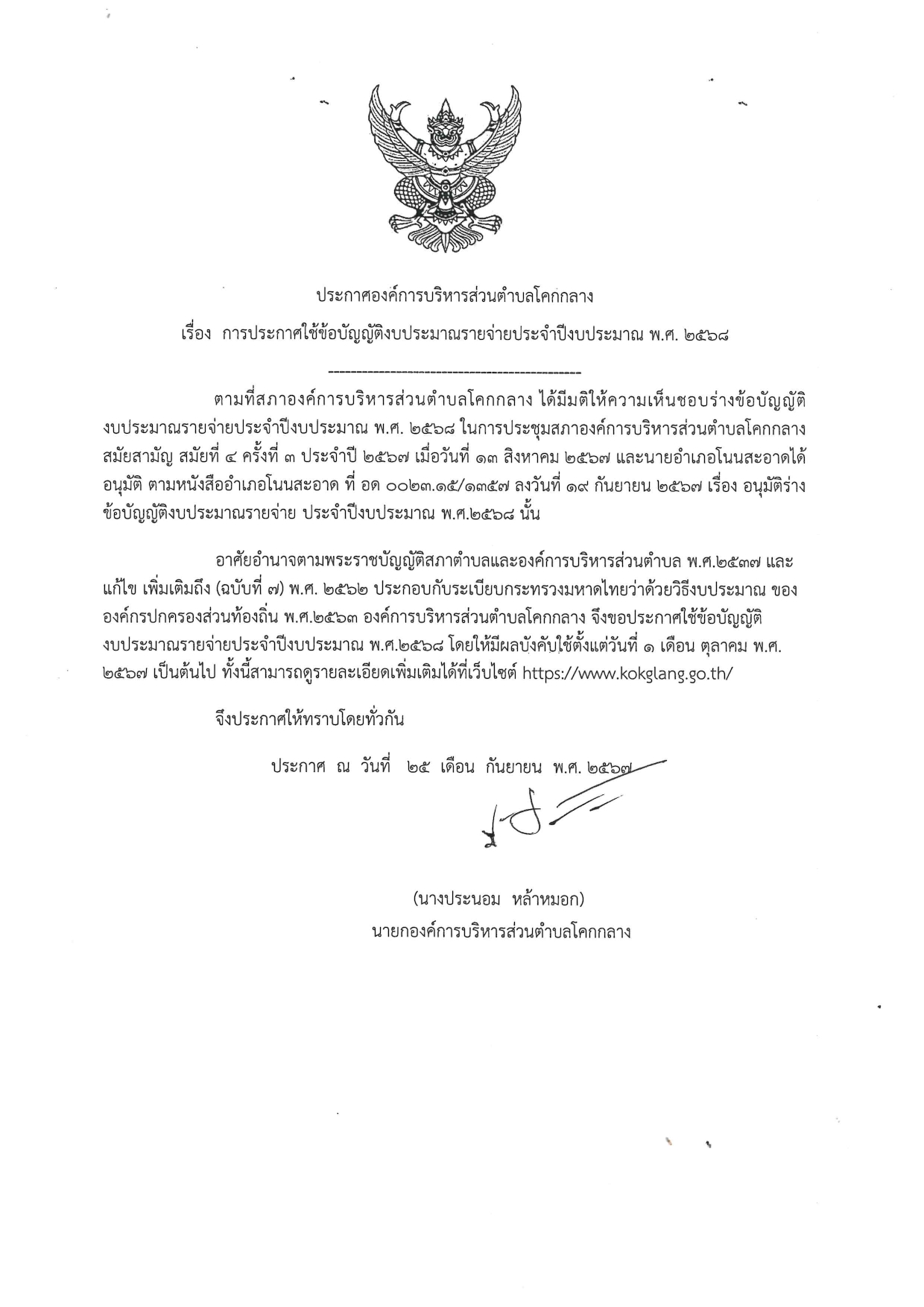 ประกาศใช้ข้อบัญญัติงบประมาณรายจ่ายประจำปีงบประมาณ 2568